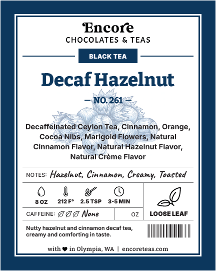 Decaf Ceylon Tea, Cinnamon, Cocoa Nibs, Orange, Natural Hazelnut Flavor, Marigold Flowers, Natural Cinnamon Flavor, Natural Creme Flavor