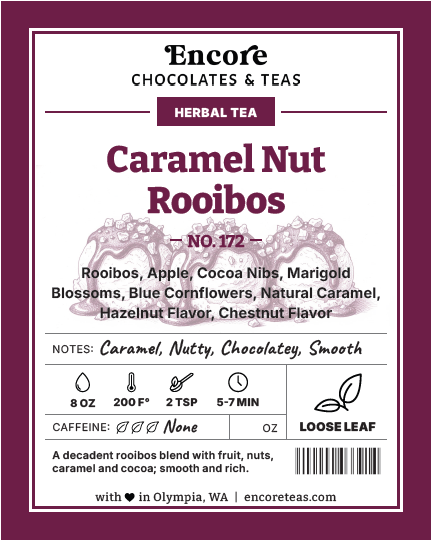 Rooibos with caramel, nuts and cocoa brews a sweet, smooth cup with relaxing depth.