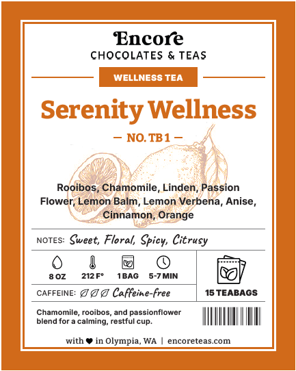 Rooibos, Chamomile, Linden, Passion Flower, Lemon Balm, Lemon Verbena, Anise, Cinnamon, Orange Pieces